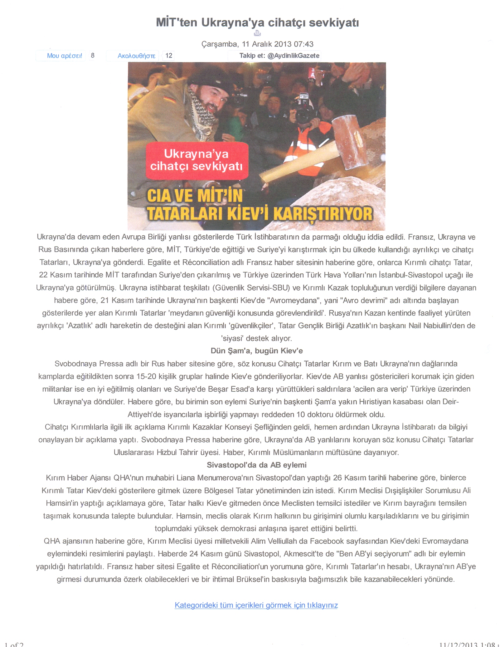 Σύμφωνα με τις πραγματικά εντυπωσιακές αυτές αποκαλύψεις αλλά και την ανταποκρίτρια του πρακτορείου ειδήσεων της Κριμαίας στην Τουρκία, Liana Menumerova, από τις 26 Νοεμβρίου είχε σημάνει «συναγερμός» και είχε αρχίσει μελή κινητοποίηση των Τατάρων και των ταταρικών οργανώσεων που βρίσκονται στην Τουρκία και ιδιαίτερα κυρίως στην Κωνσταντινούπολη. Από τότε είχε αρχίσει μέσω του αεροδρομίου της Κωνσταντινούπολης η αποστολή Τατάρων στην Ουκρανία για να προετοιμάσουν το έδαφος για σκληρές διαδηλώσεις στην πρωτεύουσα της Ουκρανίας, Κίεβο. Μάλιστα για την εγκυρότητα αυτής της αποκάλυψης η ανταποκρίτρια του πρακτορείου ειδήσεων της Κριμαίας επικαλείται και την ομολογία του Τατάρου βουλευτή της Κριμαίας, Alim Velliulah ο οποίος έχει γράψει εκείνες τις μέρες από την Σεβαστούπολη στο face book ότι προετοιμάζονται μαζικές διαδηλώσεις και ταραχές σαν αντίδραση στην επικείμενη άρνηση της ουκρανικής κυβέρνησης ουσιαστικά να παραδώσει την χώρα στην Ευρωπαϊκή Ένωση. Η ουκρανική κυβέρνηση αρνήθηκε να υπογράψει το πρωτόκολλο σύνδεσης Ουκρανίας-Ευρωπαϊκής Ένωσης αναλογιζόμενη τις βαριές συνέπειες και το μεγάλο κόστος που θα είχε μια τέτοια εξέλιξη όπως το προανήγγειλε και η Μόσχα, (ενεργειακό εμπάργκο και διακοπή των εισαγωγών από την Ρωσία των ουκρανικών προϊόντων) και οι οποίες θα έπλητταν καίρια την ουκρανική οικονομία βυθίζοντας την χώρα στο χάος εξαθλιώνοντας μεγάλες μάζες του ουκρανικού πληθυσμού κυρίως στην ανατολική Ουκρανία που έχει στενές οικονομικές σχέσεις με την Ρωσία. Το όλο θέμα όμως εκτός από την οικονομική του διάσταση έχει και βαθιές γεωστρατηγικές προεκτάσεις. Είναι γνωστό πως οι Τάταροι που υποκινούνται από την Άγκυρα και με την βοήθεια των Αμερικανών και των δυτικοευρωπαίων εδώ και καιρό επιδιώκουν να προκαλέσουν μεγάλες ταραχές για να βρουν την ευκαιρία να προχωρήσουν σε απόσχιση από την Ουκρανία και να κηρύξουν την αυτονομία τους σε μια περιοχή μεγάλης γεωστρατηγικης σημασίας που στη συνέχεια θα γίνονταν δορυφόρος της Δύσης. Λογάριασαν όμως χωρίς τον ξενοδόχο γιατί δεν υπολόγισαν την έντονη ρωσική αντίδραση που θα έβαζε φραγμό σε όλα αυτά τα σχέδια. Εντυπωσιακό είναι επίσης το στοιχείο που αποκαλύπτει η τουρκική εφημερίδα ότι οι ίδιες οι εξτρεμιστικές ισλαμικές οργανώσεις που στηρίζει η Τουρκία για να πολεμούν το καθεστώς Άσανντ στην Συρία, οι ίδιες πρωτοστατούν και στην πρόκληση, μέσω του μουσουλμανικού ταταρικού στοιχείου των ταραχών και της επιχείρησης αποσταθεροποίησης της Ουκρανίας. Μάλιστα το σύνθημα τους σύμφωνα με την Aydınlık, είναι, «Dün Şam bugün Kiev’e», δηλαδή, «Χτες Δαμασκός σήμερα στο Κίεβο».